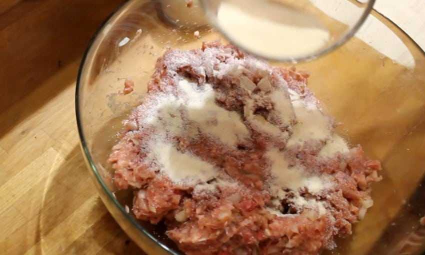 3. Порциями вливайте молоко и смотрите на консистенцию: фарш должен стать вязким, но не растекающимся. Часть молока может остаться.