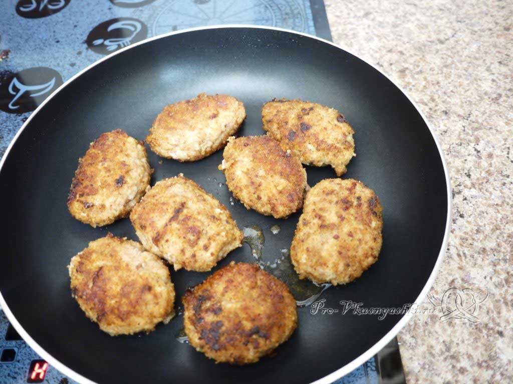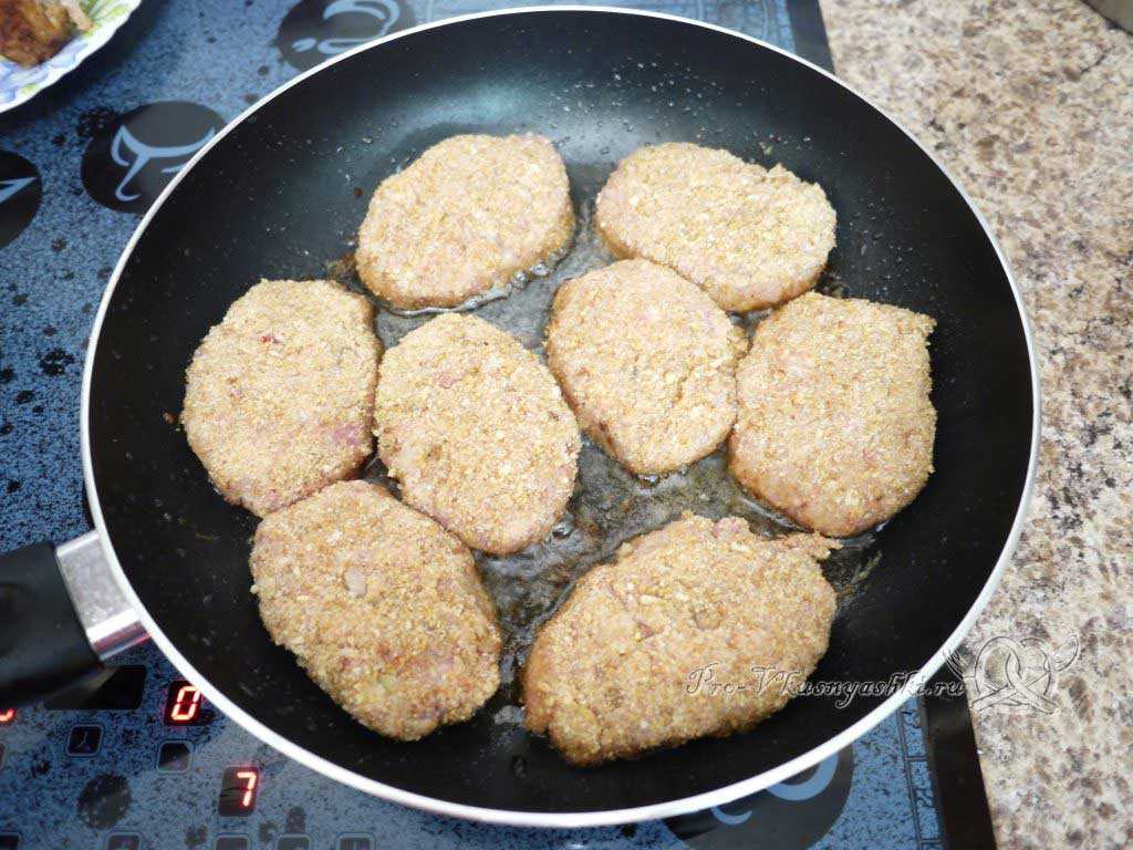 Когда масло разогрелось (при опускании в него продуктов, оно начинает шипеть) помещаем в сковороду наши котлеты и жарим 5-7 мин до золотистой корочки. Огонь убавляем до среднего (7 из 9).