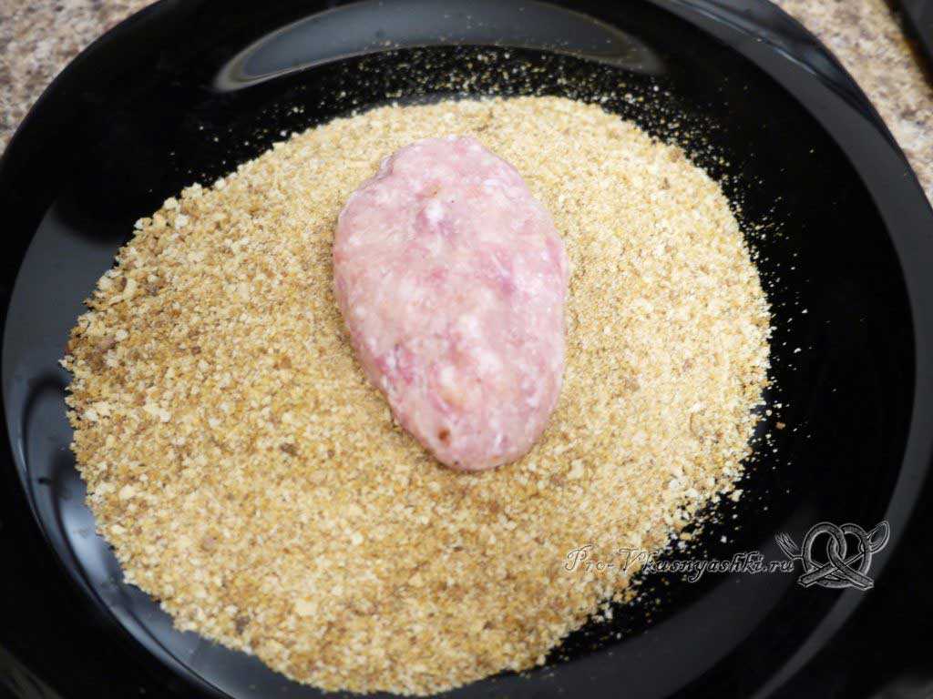 Мокрыми руками формуем котлеты и обваливаем их в сухарях.