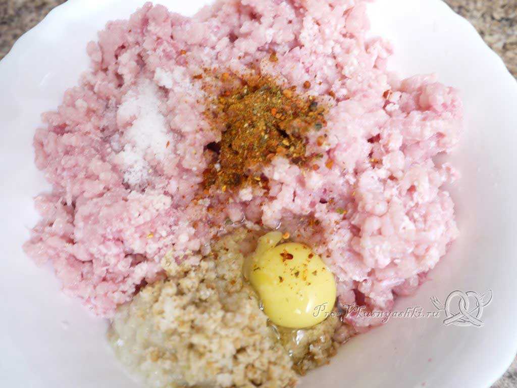 Замоченный хлебушек, вместе со сливками (даже если хлеб не впитал полностью сливки, выливаю их в фарш). Соль, перец — по вкусу. Иногда добавляю чеснок (измельчённый), но очень редко, больше люблю без чеснока. Приправ никаких больше не добавляю, но это дело вкуса.