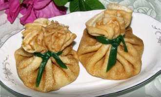 Мешочки из блинчиков с шампиньонами и куриной грудкой Рецепт приготовления данного блюда следующий: 250 мл. муки; 300 мл. молока; 1 большая ложка сахара; 2 яйца; 2 куриных филе;...