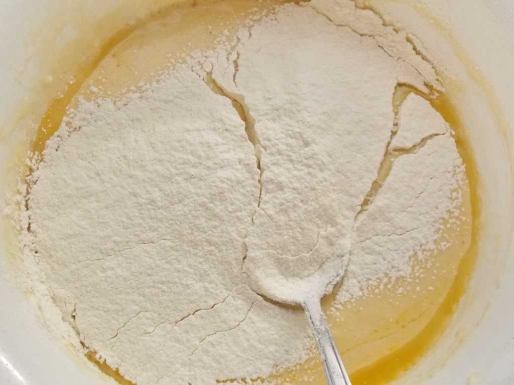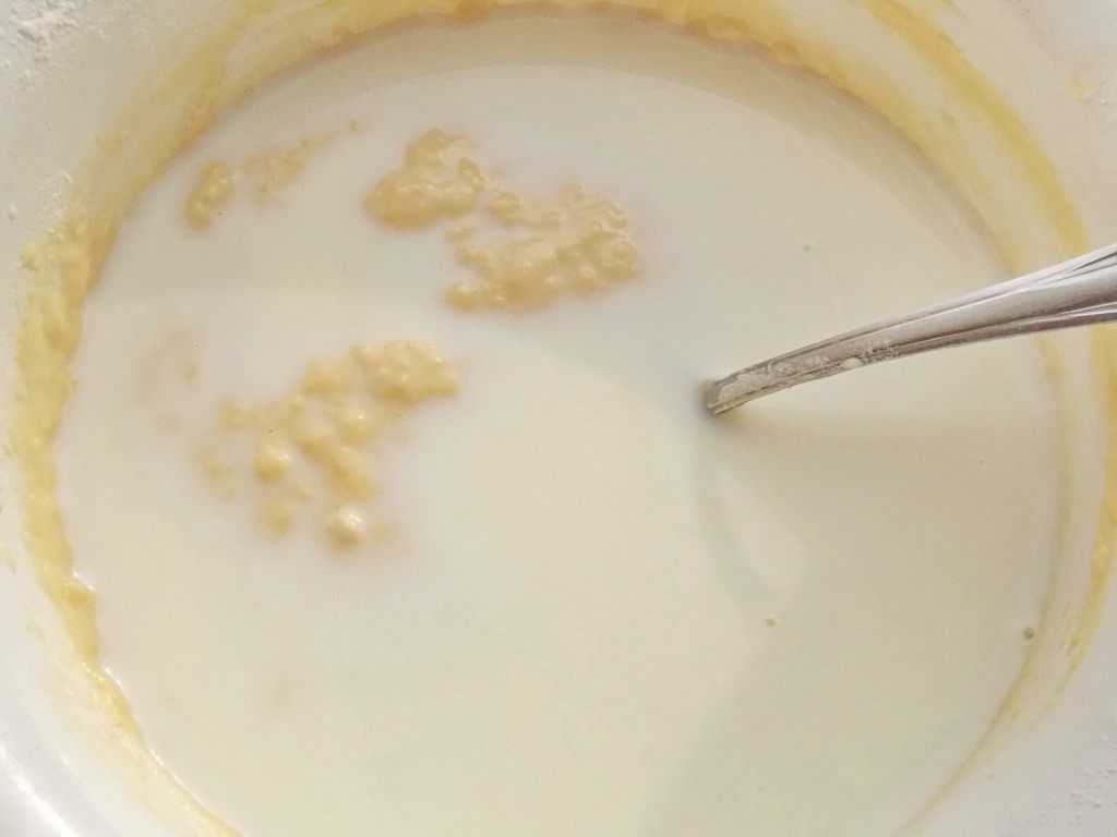 - Затем всыпать сюда оставшуюся часть муки. Получится густое тесто, которое нужно разбавить теплым, но не горячим молоком. В конце налить все указанное масло и хорошо перемешать.