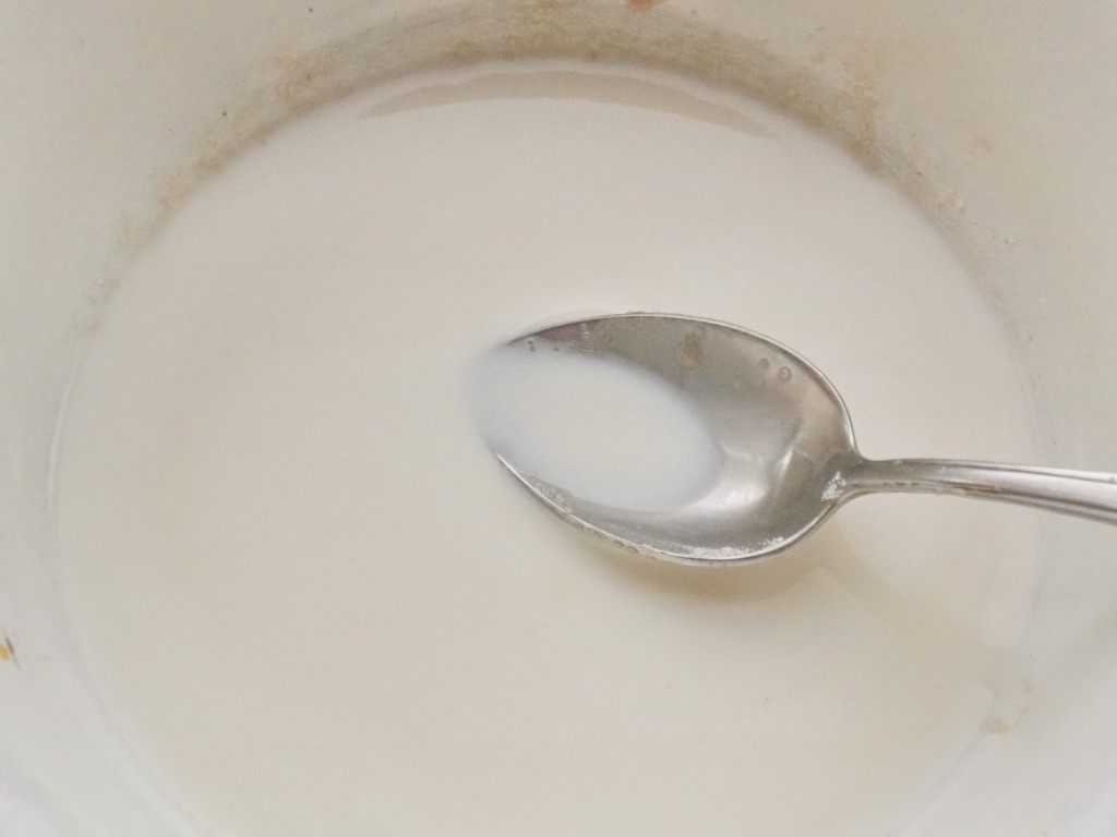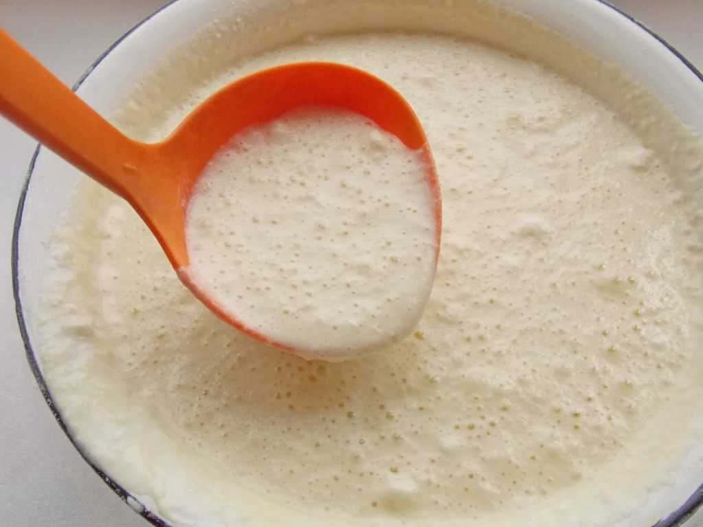- Подогреть оставшееся молоко, чтобы оно было горячим, влить его в тесто и положить соду, хорошенько перемешать. Сода нужна для того, чтобы погасить кислоту сметаны и кислоту, которая образовалась в процессе брожения теста. Взбить в крепкую пену белок, выложить его в тесто и аккуратно перемешать.
