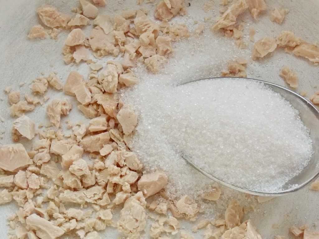 - Оставшийся сахар нужно перетереть вилкой с желтками, а белки нужно отставить в сторону.