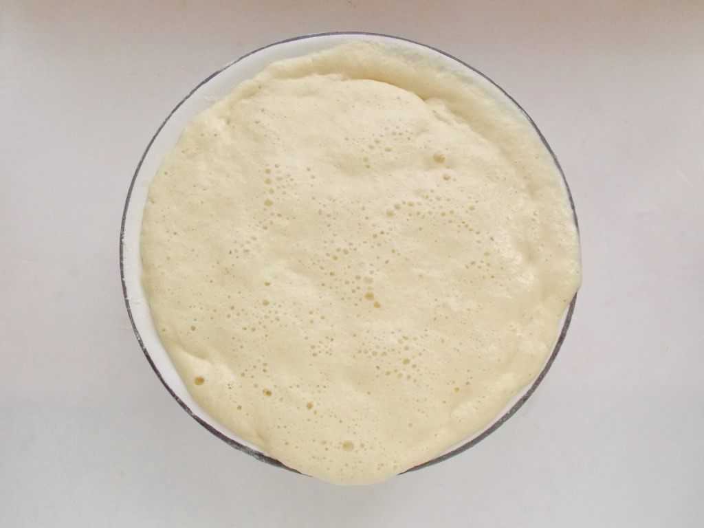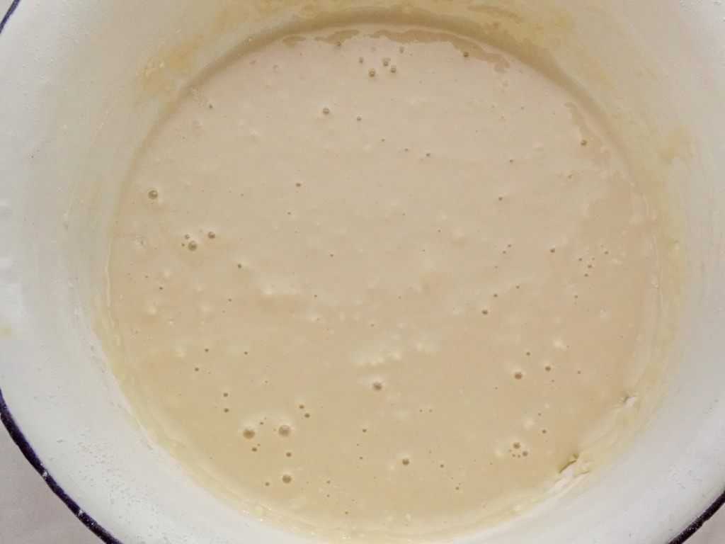4. Когда опара увеличится в 2-2,5 раза, тонкой струйкой влейте в нее оставшуюся теплую воду – 400 мл, одновременно перемешивая массу венчиком.