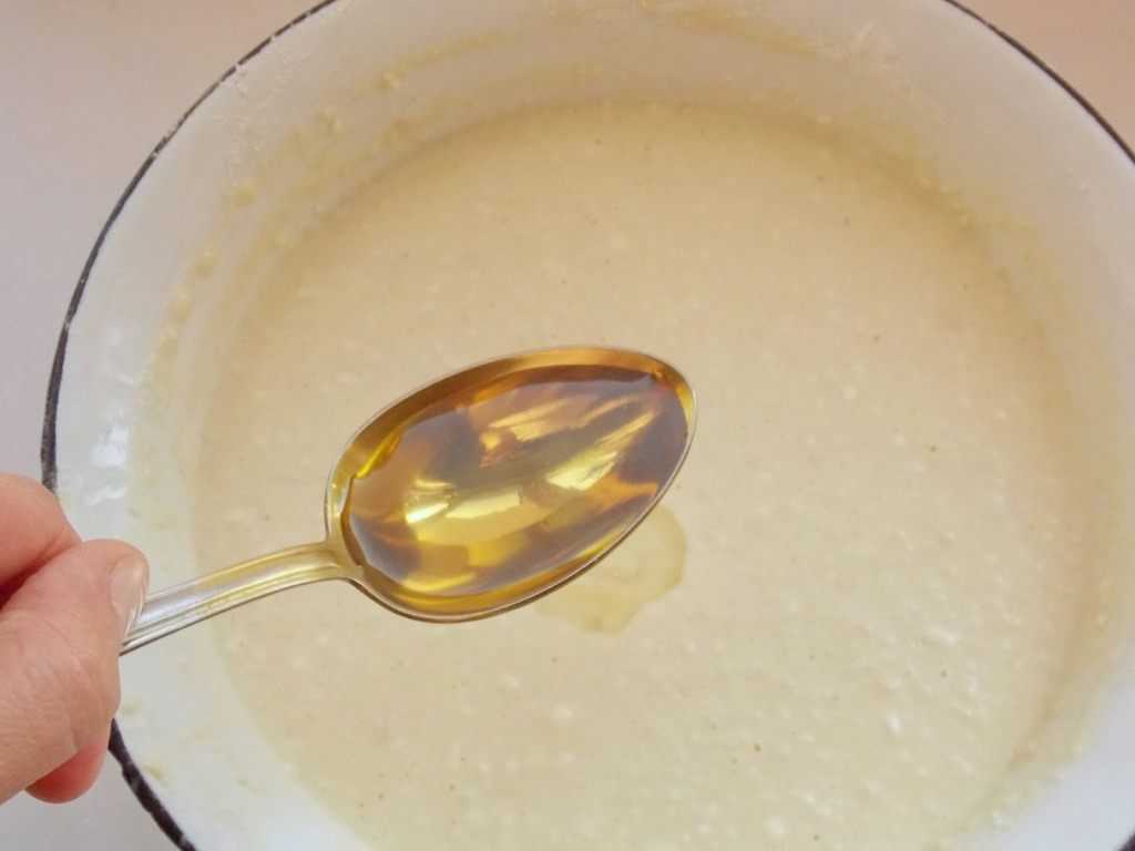 Накройте ёмкость с тестом плёнкой и оставьте при комнатной температуре примерно на 1 час. Влейте в готовое тесто масло.