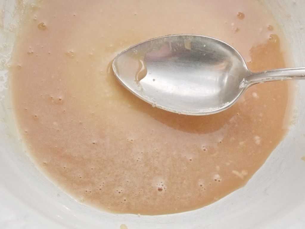 - Добавить кипятка столько, чтобы тесто получилось похожим на жидкую сметану, немного остудить, ввести дрожжи.