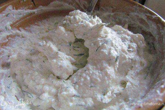 Для начинки смешать творог, измельченный чеснок, мелко порубленный укроп и пару ложек майонеза. Можно воспользоваться блендером.