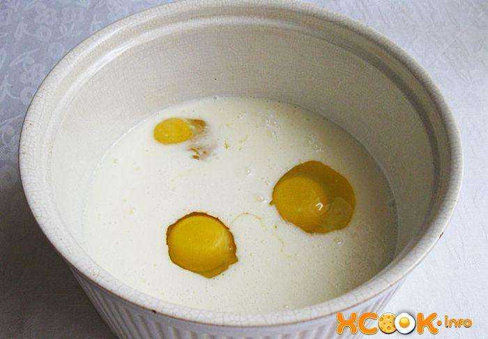 - Кефир слегка подогревается на плите или в микроволновке, к нему добавляется яйцо и растительное масло.