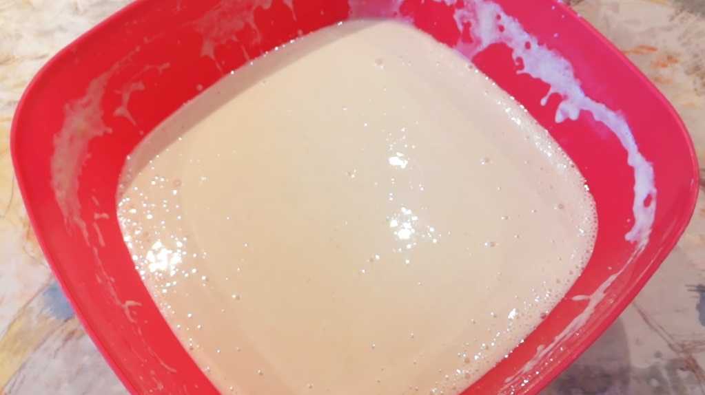 После этого дайте тесту настояться еще 30-40 минут. Пока тесто подходит его нужно периодически помешивать, насыщая кислородом. Оно получается очень воздушным и по консистенции напоминает взбитую мыльную пенку.