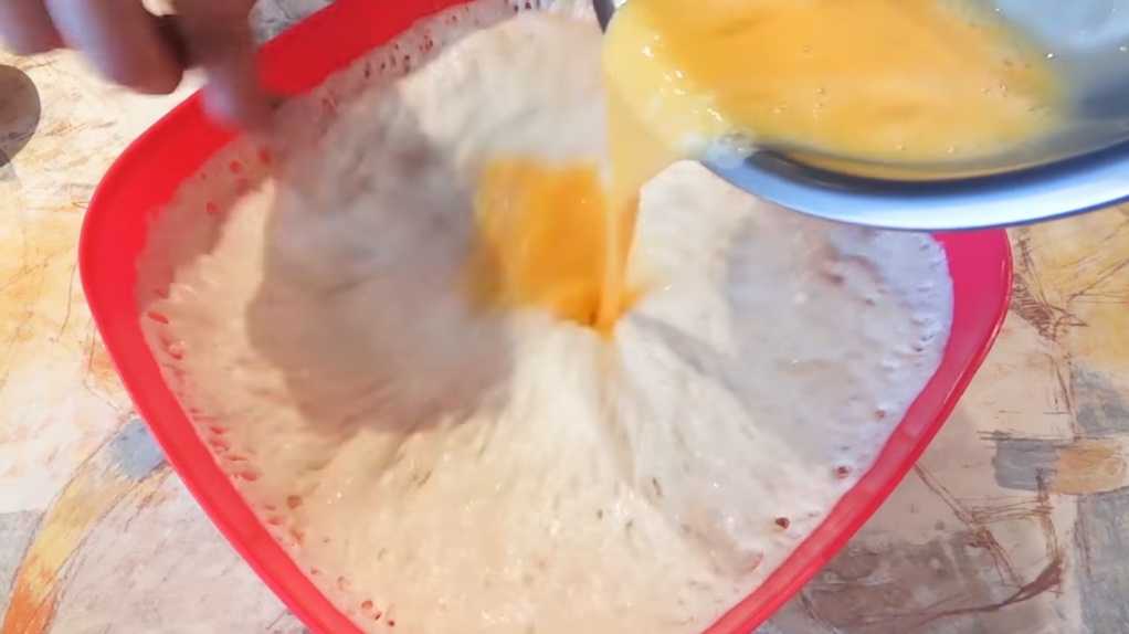 Далее взболтайте яйца и понемногу влейте их в тесто не забывая перемешивать.