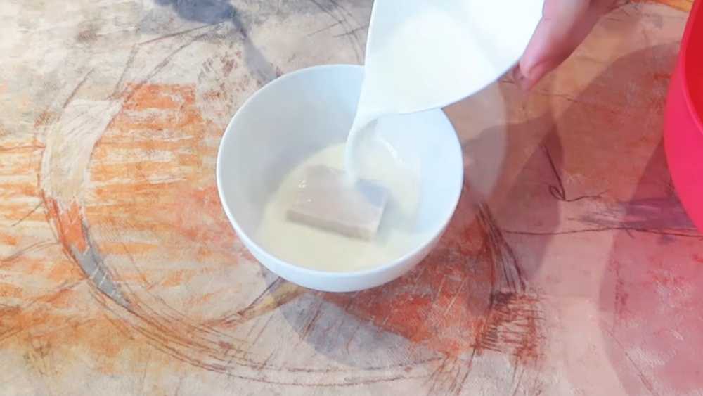 Первым делом нужно подогреть до теплого состояния 3 стакана молока. От этого количества возьмите немного молока, чтобы растворить живые дрожжи, вместо свежих можно взять сухие.