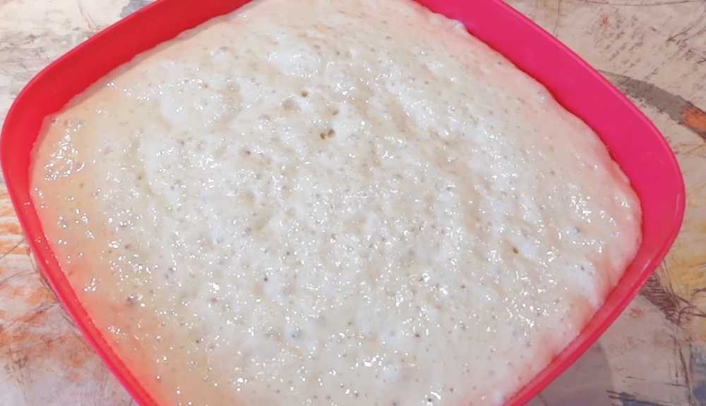 7. Через час наше тесто подошло. Оно увеличилось в размерах и запузырилось.