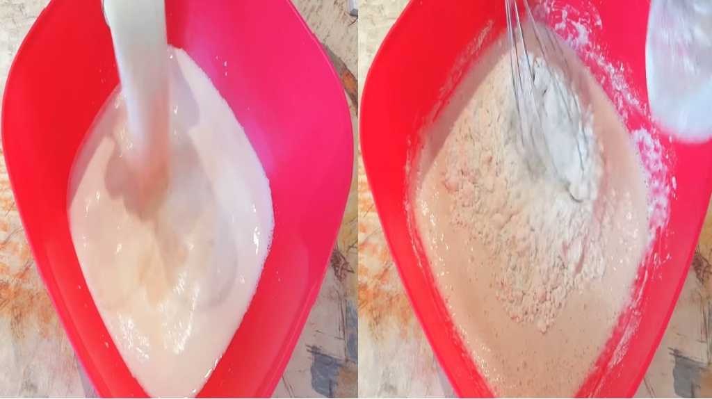 - Молоко закипятим и сразу же вольем тоненькой струйкой в тесто, которое через полчаса успело набухнуть. Непрерывно перемешиваем венчиком, благодаря чему образуется много мелких пузырьков.