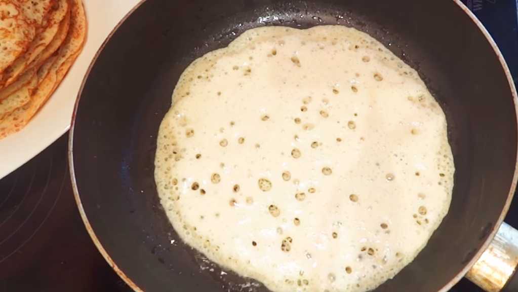 5. Для выпечки первого изделия хорошенько прогреть сковородку и смазать ее небольшим количеством масла. Налить порцию теста и обжарить секунд 20 — 30. За это время вся поверхность покроется множеством маленьких дырочек, а низ подрумянится.