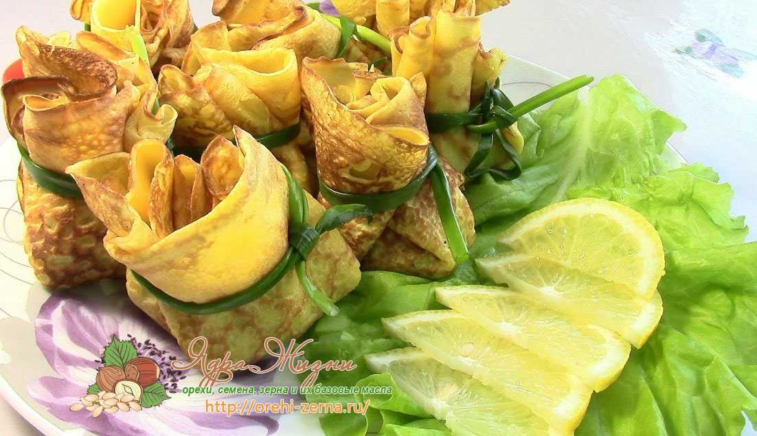 Большинство хозяек озадачены вопросом: «Чем завязать блины фаршированные в мешочке?». Так в роли «бечевки» для соленых блинчиков может выступать: