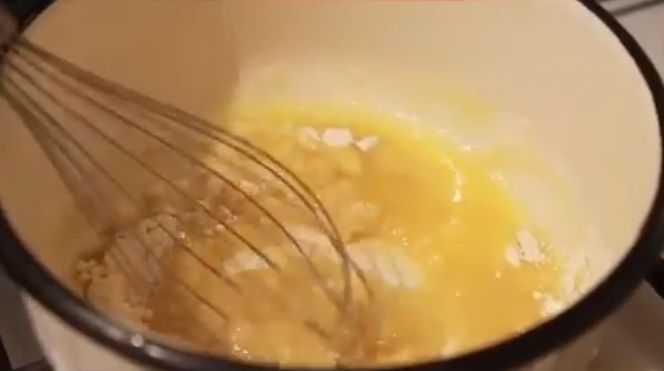Для приготовления соуса разогреем в сотейнике сливочное масло. Когда масло начинает закипать добавляем к нему муку и быстро ее обжариваем. Непрерывно помешивая, чтобы не было комочков, до полного растворения.
