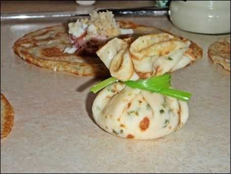 - Смешиваем все заявленные компоненты и начиняем блины в форме мешочков. Такую закуску можно подавать и в охлажденном виде, и в горячем.