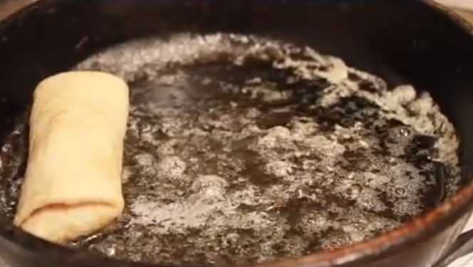 И непосредственно перед подачей на стол выкладываем каждый фаршированный блинчик на разогретую сковородку со смесью растительного и сливочного масла и обжариваем их.