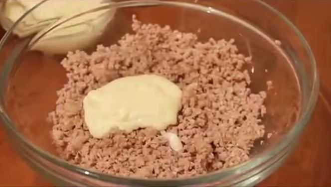Фарш слегка посолим, немного поперчим и небольшими порциями, буквально по 2 — 3 столовые ложки, начинаем вмешивать сливочный соус.
