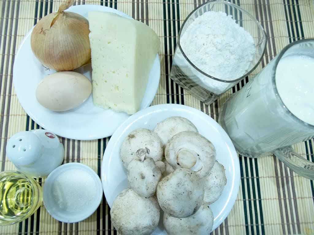 • Яйца – 2 шт.• Сахар – 2 ст. л.• Соль -1/2 ч. л.• Мука – 2• Молоко• Шампиньоны -800-1000 г• Лук – 2 шт.• Сыр-200 г• Майонез -100 г• Растительное масло -для жарения