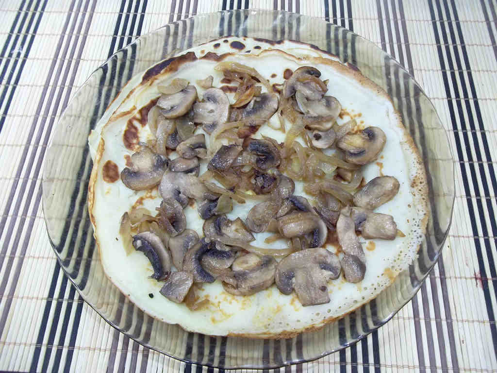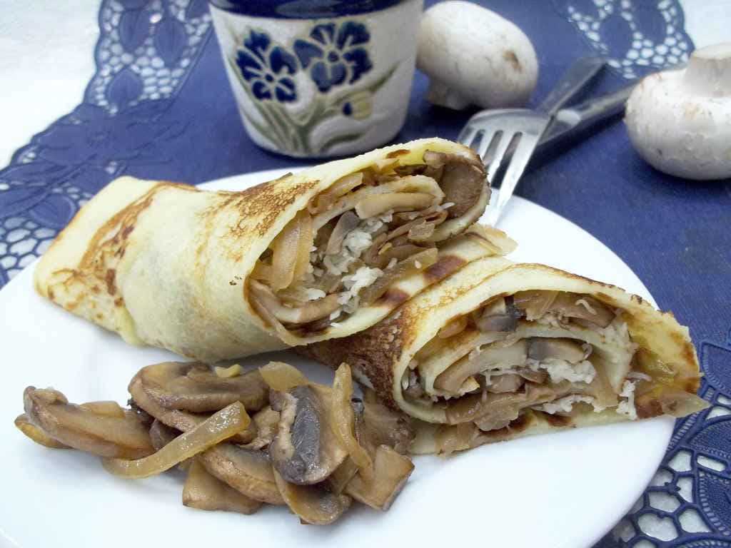 Грибы применяйте либо купленные в супермаркете, либо собственноручно собранные осенью в лесу. Сами блины можете печь по своему проверенному рецепту, либо воспользоваться данной рецептурой. Главное, чтобы они были тонкими, тогда они будут легко сворачиваться в форме трубочки или конвертика.