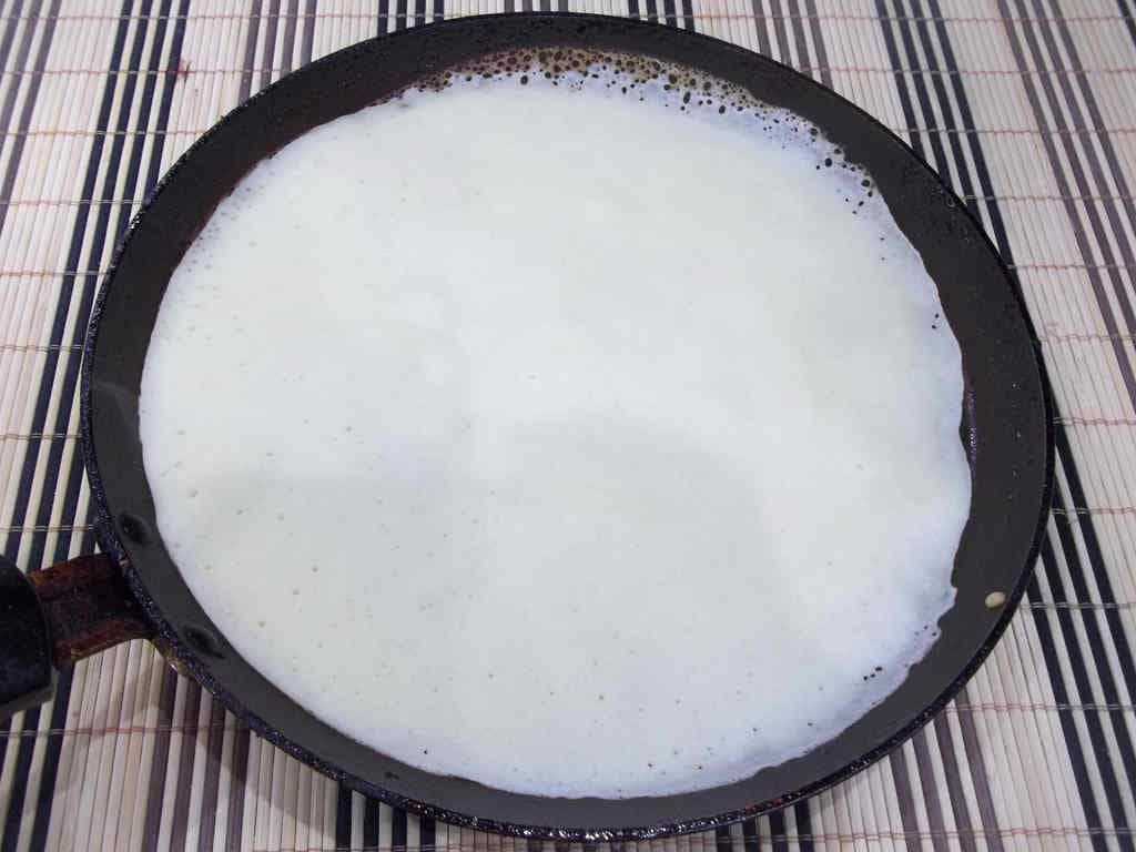 Поскольку мы готовим блины, которые будут фаршированные, то они должны быть тонкие. На этот фактор влияет густота теста. Поэтому если оно у вас получится слишком густым, то долейте еще молока и доводите его до жидкой консистенции, похожей практически на воду.