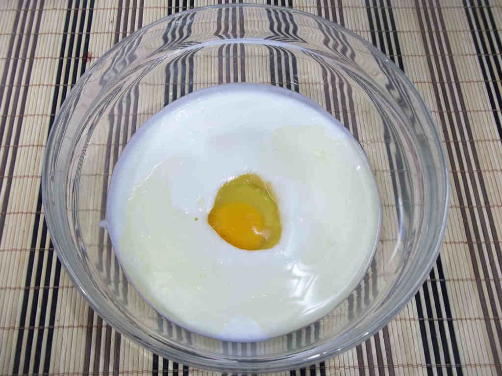 Яйца разбить в миску, разболтать ложкой, добавить пол стакана тёплой воды, хорошо размешать.