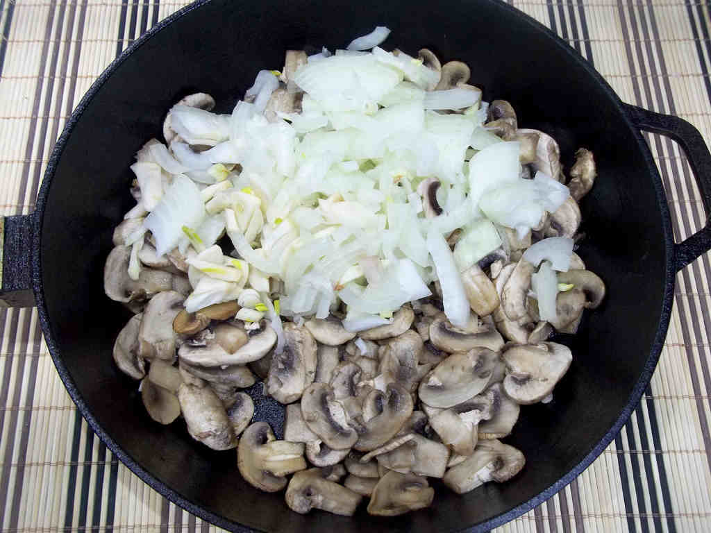Для начинки вымытые шампиньоны нарежьте соломкой или кубиками и положите в нагретую сковороду с растительным маслом. Немного их прожарьте, чтобы испарилась вся лишняя влага, и добавьте нашинкованную полукольцами луковицу.