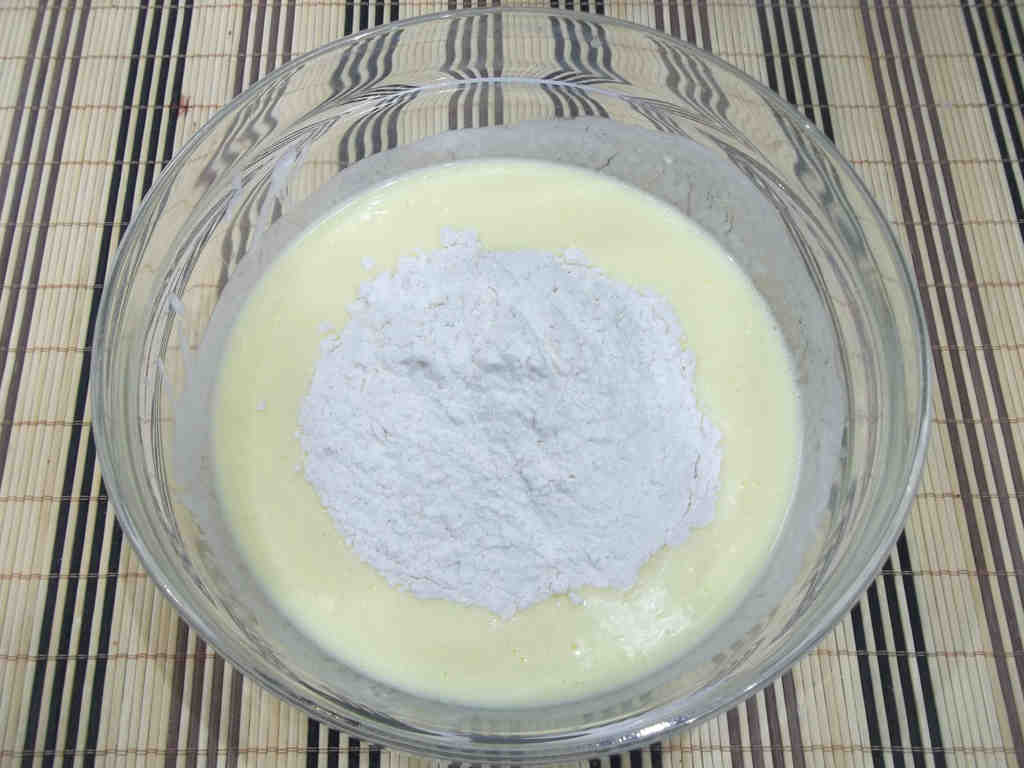Хорошо вымешайте жидкость и просейте через сито муку.
