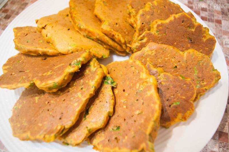 Такое блюдо хорошо подавать с овощами. С данного количества ингредиентов получается около 20 оладий. Приготовление займёт примерно 40-45 минут. Предложенный вариант приготовления оладий из гороховой муки подходит для вегетарианского питания, так как не содержит в составе продуктов животного происхождения.
