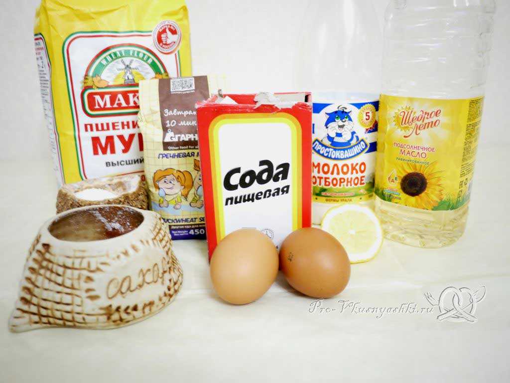 Готовятся из 100 граммов гречневой муки, одного яйца, 200 миллилитров питьевой воды, чайной ложечки меда, гашеной соды и чайной ложечки растительного масла. Вода подогревается, после чего в ней разводится мед. Затем в миску добавляются сода, масло и яйцо. Все составляющие перемешиваются с использованием миксера. Мука постепенно засыпается в ту же миску, причем необходимо будет периодически мешать тесто. Блины обжариваются с каждой стороны на разогретой сковороде.