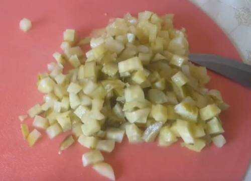 1. Чистим огурцы соленые от кожицы и мелко крошим.