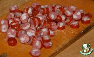 Копчености, кроме сосисок, слегка обжарить на сухой сковороде, это поможет убрать из них излишний жир.