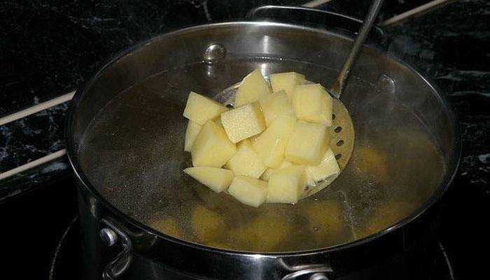 - Картошку режем кубиками, кладем в кипящий говяжий бульон.