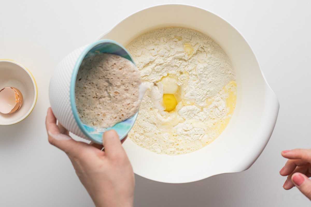 Это способ, при котором в тесто добавляют опару — смесь дрожжей, теплой жидкости и сахара или муки. Опара должна быть жидкой: если вы готовите простое тесто на килограмм муки, для опары вам понадобится примерно 100 миллилитров теплой воды или молока, 10 грамм сухих дрожжей и чайная ложка сахара или муки.