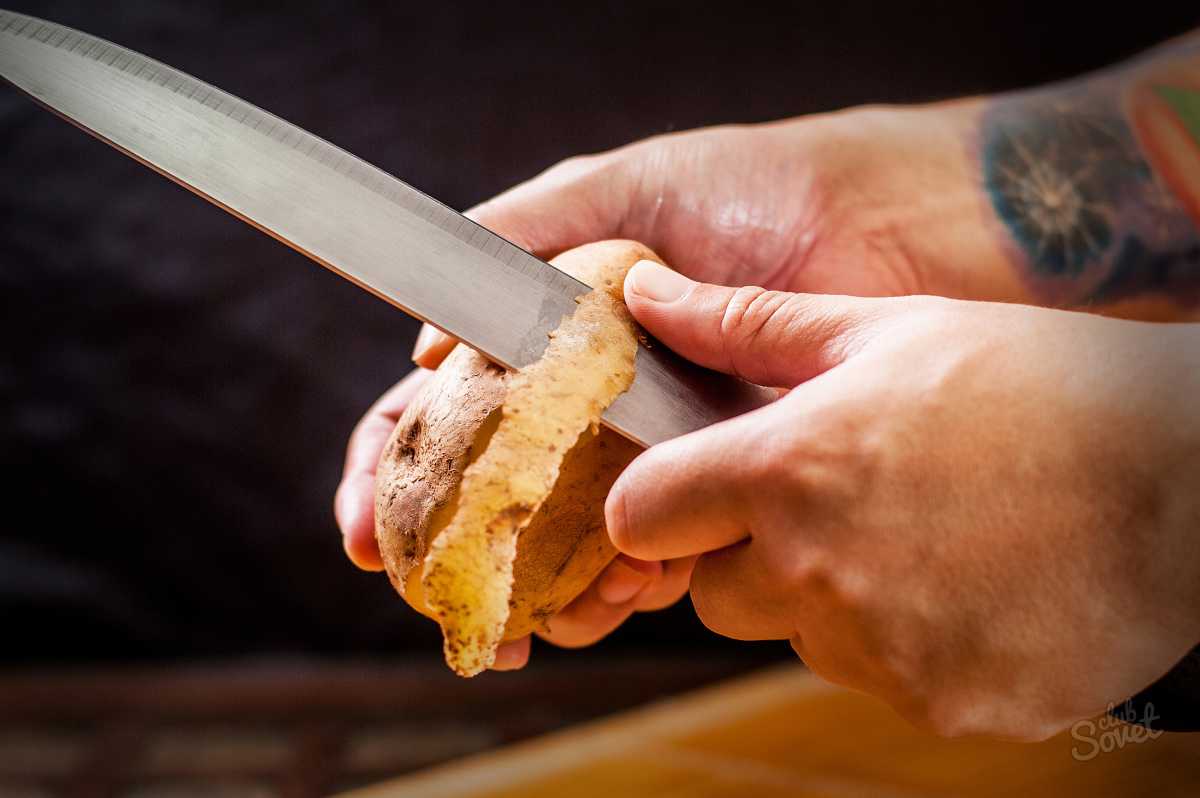Самый древний и проверенный способ очистки картофеля — это применение ножа или другого острого продолговатого предмета, внешне напоминающего нож. Однако сразу стоит отметить, что это и самый долгий способ из всех нижеописанных.