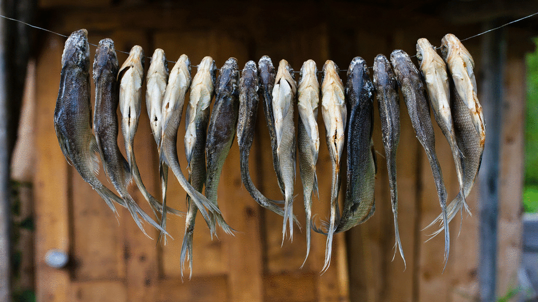 - Приготовление вяленой рыбы — процесс, требующий недельной просушки.