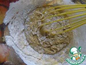 Смешать оба вида вида муки, соль, пряности. В медово-яичную смесь добавить масло, перемешать и постепенно всыпать мучную смесь.