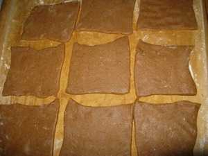 Раскатайте тесто в пласт толщиной 0,5 см и разрежьте на 9 квадратов. Стол хорошо подпылите мукой, а то тесто может прилипнуть.