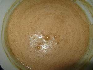 В теплую смесь добавить соду и перемешать. Сода обычно хорошо гасится медом, но если вы в качестве своего меда не уверены, лучше заменить соду разрыхлителем (в 2 раза больше количества соды).
