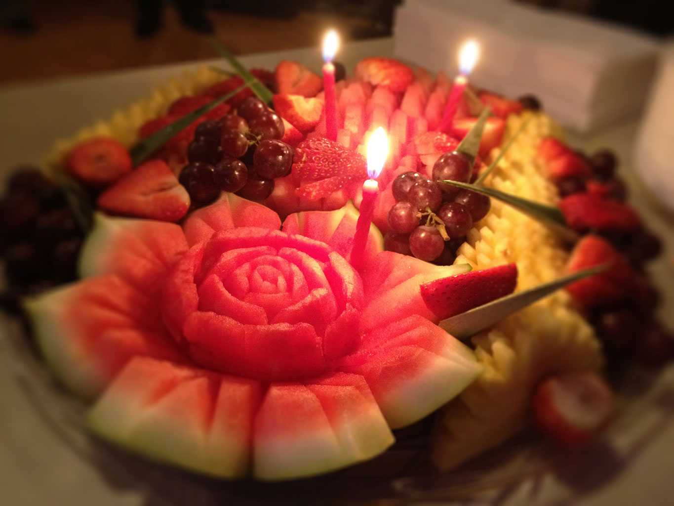 Вырезанные из фруктов цветы и фигурки обязательно привлекут внимание к десерту