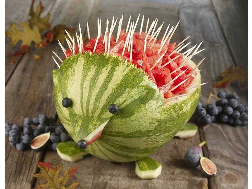 Очень частой формой нарезки арбуза является ежик. Для этого шкурке арбуза придают форму этого животного, а внутрь укладывают нарезанную на квадратики мякоть, нанизанную на зубочистки.