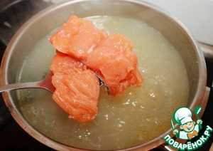 После закипания кастрюльки с картофелем добавляем филе красной рыбы и варим минут 15-20.