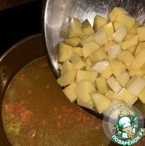 - Бульон посолите и добавьте в него картофель и морковь, предварительно нарезанные кубиками.