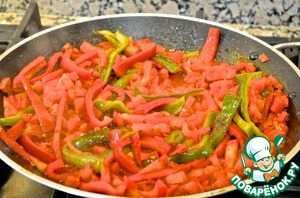2. Для софрито: в соках, оставшихся от мяса и рыбы, потушить полоски зеленого и красного перца.
