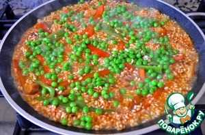 9. Влить бульон, добавить горошек. Рис должен быть равномерно распределен по дну сковороды. После того, как бульон влили в сковороду, мешать рис уже нельзя.