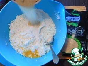 К творогу добавляем сахар яйцо и 2/3 муки (остальная нужна для панировки). Как следует все перемешиваем.