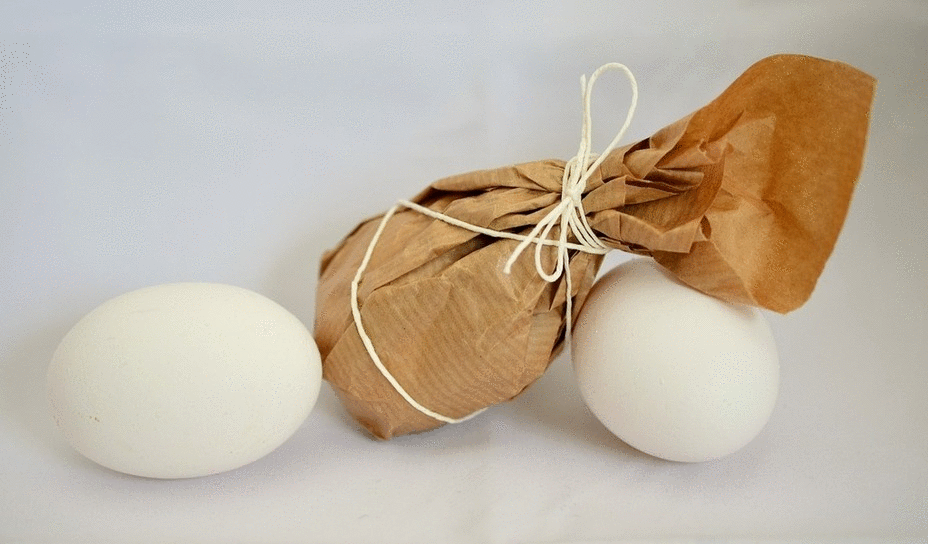 - Яйца тонко смазывают жиром (подсолнечным маслом, вазелином, парафином и т. д.). Заворачивают в бумагу, кладут в проветриваемую тару (ящик либо корзину) и подвешивают в прохладной комнате. Вместо жира можно смазать скорлупу яичным белком.