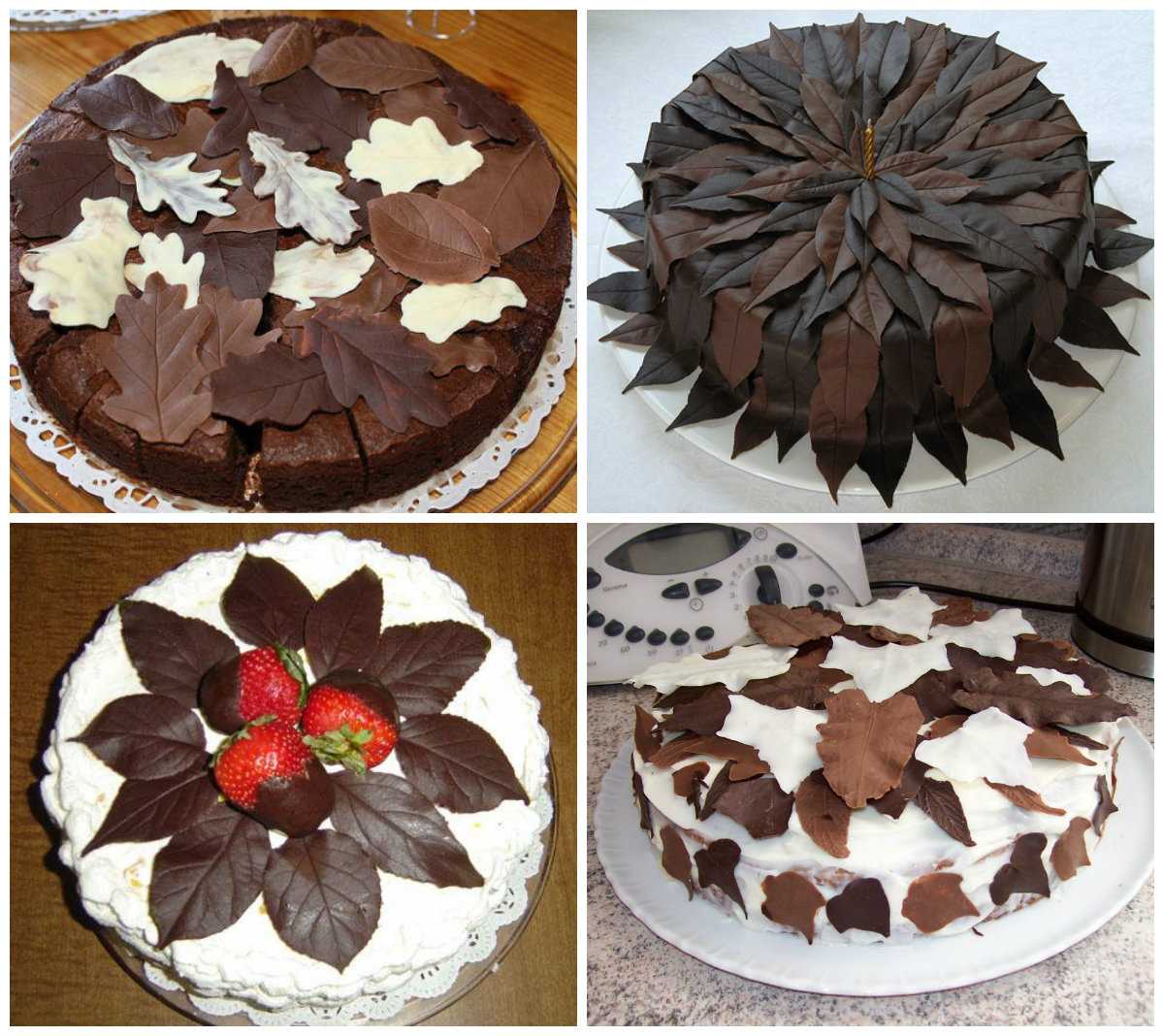 Шоколадные листья на торте смотрятся эффектно, а особых усилий в плане изготовления не требуют. Для их создания понадобятся листочки любого дерева (зимой могут выручить листики комнатных растений). Их нужно хорошенько промыть и высушить. Затем равномерно наносите на них кисточкой растопленный шоколад. Шоколадные листики будут выглядеть более реалистично, если шоколад нанесен на обратную часть листа – ту, которая с прожилками. После застывания аккуратно отделите настоящие листья от шоколадных.